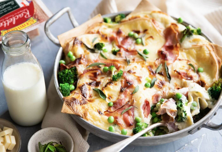 Lasagne à la raclette, brocolis, petits pois et pancetta