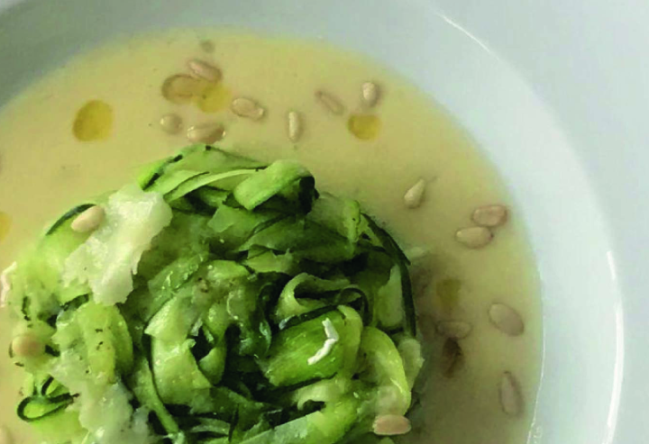 - Place au dressage : disposez les tagliatelles de courgettes au centre des assiettes. Versez la sauce au Saint Mont tout autour et parsemez de pignons de pin.