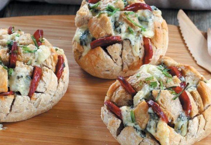- Glissez les rondelles de chorizo dans les fentes du pain, puis ajoutez les cubes de fromage.