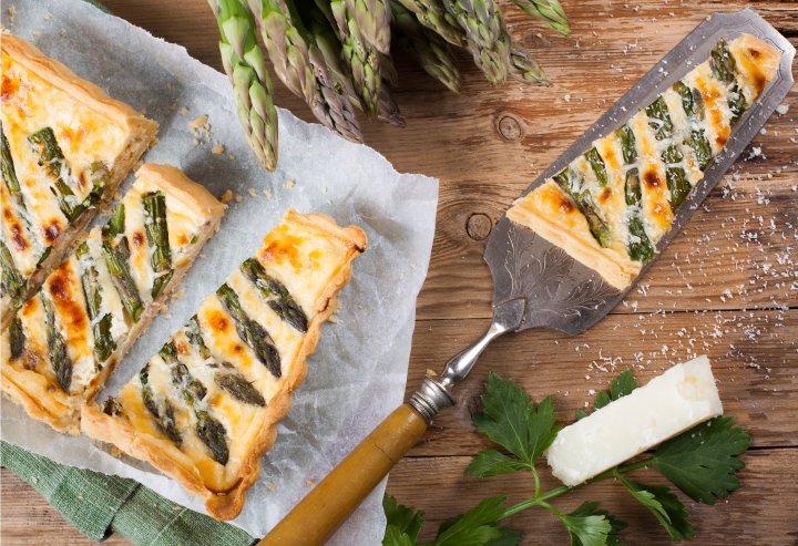 - Déroulez la pâte brisée dans un moule. Répartissez les asperges et la tomme de brebis coupée en lamelles.