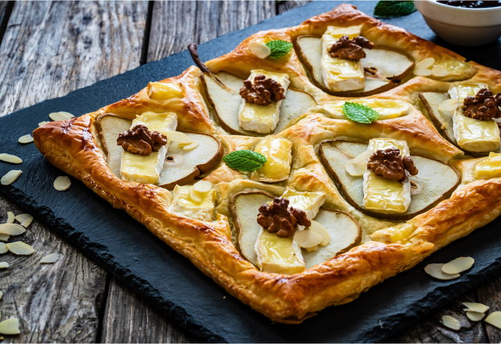 - Disposez les lamelles de poires sur la pâte feuilletée puis ajoutez les tranches de camembert. Déposez les cerneaux de noix sur les poires et parsemez d’amandes.