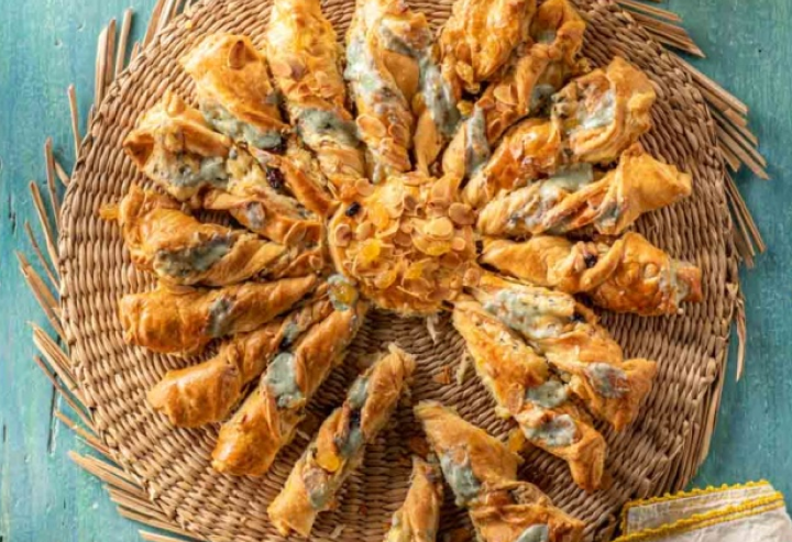 Vous recevez à la maison ? Cette tarte soleil apéritive met en scène un mélange inattendu : Fourme d’Ambert, raisins blonds et amandes croquantes. Du goût et de la générosité !