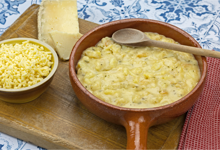 - Baissez le feu. Ajoutez les lamelles de Salers et mélangez délicatement à l'aide de deux cuillères en bois jusqu'à ce que le fromage commence à filer.